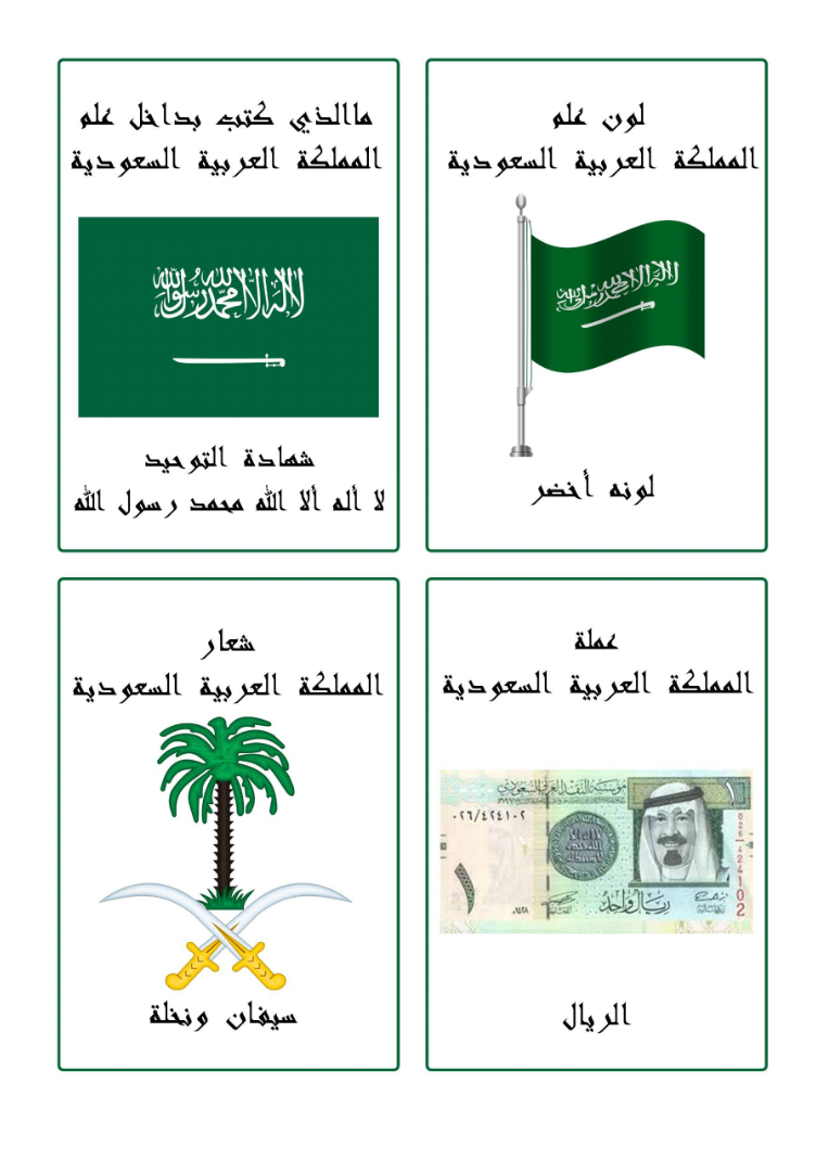 علم المملكة العربية السعودية ي عد العلم أو الشعار في المملكة العربية السعودية رمزا للحاكم وللدولة وللرمز دلالة واحدة ومعنى محدد يستوعبه الجميع ويتفق على معرفة دلالته الوطنية والدينية وع رف العلم السعودي بأنه. لون الخلفية باللون الأخضر. يتسم علم المملكة العربية السعودية بلونه المميز والعريق وهو اللون الأخضر الرائع أما بالنسبة إلى عرض العلم السعودي فهو يساوي ثلثي طول العلم ويتوسطه جملة لا إله إلا الله محمد رسول الله ومذيلة من الأسفل. كتابة عبارة لا إله إلا الله وأن محمدا رسول الله في وسطها باللون الأبيض.