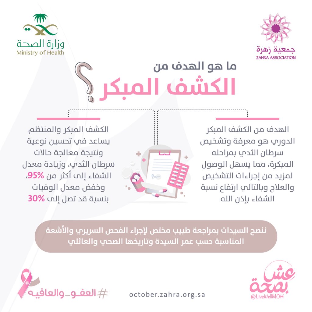 تقرير عن حملة التوعية بسرطان الثدي. وأوضح تقرير صدر عن المركز الوطني للإعلام والتوعية الصحية أن سرطان الثدي السبب الخامس للوفاة من السرطان عموما 522000 حالة وفاة بينما هو السبب الأكثر شيوعا للوفاة بالسرطان بين النساء في الدول الأقل نموا 324000 حالة.