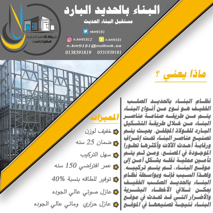 تكلفة البناء بالحديد البارد. تحول جديد يساعد في التخلص من عيوب السطح. عيوب البناء بالحديد البارد أو ما يعرف بالصلب المجلفن على البارد ويعرف هذا النوع من الحديد بأنه تقنية جديدة وحديثة في عالم البناء من خلاله سيتمكن الكثير من إعادة إعمار منازلهم بكل سهولة دون الحاجة لاتباع النظام. وتصلح تقنية البناء بالحديد البارد لبناء أدوار إضافية في البيوت القديمة ذات الأساسات المتهالكة نوعا ما والفلل والشاليهات والمزارع والديوانيات إضافة إلى المخازن والمباني الصناعية وسكن العمال كذلك. البناء بالحديد البارد ضمان 25 عام السلام عليكم ورحمه الله اعرض عليكم بناء بطريقه حديثه موفره للمال والوقت صديق للبيئه البناء بالكامل من الهياكل المعدنيه الحديد.