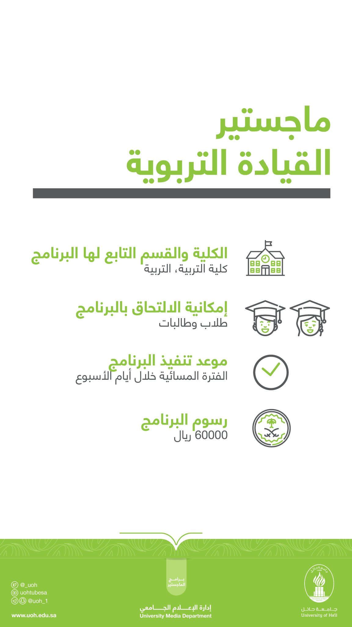 جامعة حائل الدبلوم التربوي. مرحبا بك في جامعة حائل. معتمد من جامعة حائل ووزارة التعليم بواقع فصل دراسي واحد عدد الساعات 44 ساعة 16 ساعة بنظام التعليم الصفي التقليدي 28 ساعة بنظام التعلم الإلكتروني. أعلنت جامعة حائل عن فتح باب القبول لبرنامج دبلوم التربية العام و برامج الدراسات العليا لــ مرحلة الماجستير في عدد من التخصصات ابتداء من يوم الأحد 19 شوال 1437هـ وحتى يوم الثلاثاء 28 شوال 1437هـ وذلك عن طريق بوابة قبول. حائل نت حائل.