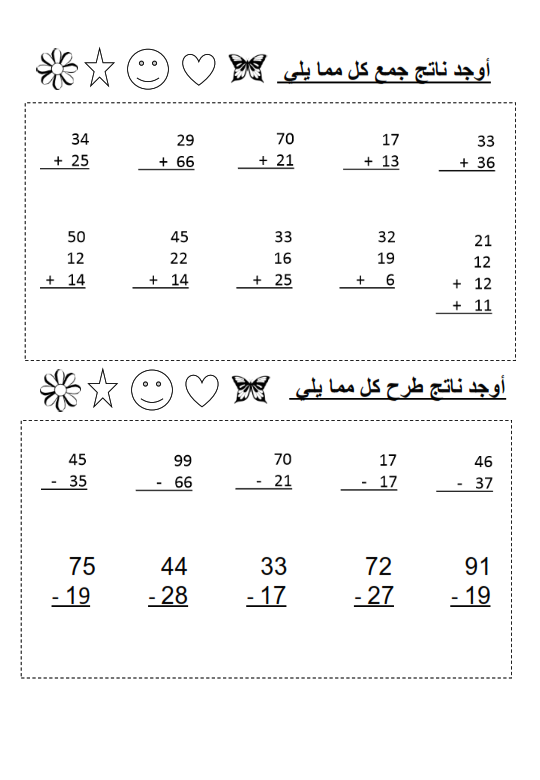 ورقة عمل لجمع وطرح الأعداد الصف الأول رياضيات الفصل الأول ملفات الكويت التعليمية