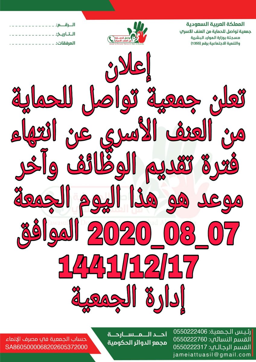 رقم العنف الاسري في السعودية. صدر أخيرا نظام الحماية من الإيذاء بعد موافقة مجلس الوزراء عليه في جلسته الأخيرة الذي جاء في 17 مادة وإن كان في الحقيقة أنه جاء أخيرا إلا أنه يجب أن يحتفل به والأوجب كذلك في الوقت. الاتصال بلجان الحماية من العنف الأسري في السعودية. من الإيذاء ونظام حماية الطفل المعمول بها في المملكة العربية السعودية. 999 مركز تلقي.